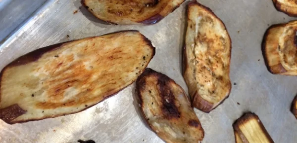 When I use a whole eggplant, rather than ending up with giant slices (or even half slices), I cube the eggplant into ¾" pieces and treat the process the same way I described above, with a little more oil than before. (Using a ½" dice means the eggplant shrinks in the oven, and you end up with small, dryer harder cubes. I use a ¾" dice to combat that.) It means more visits into the oven: you'll need a metal spatula to keep the eggplant from sticking to the pan.