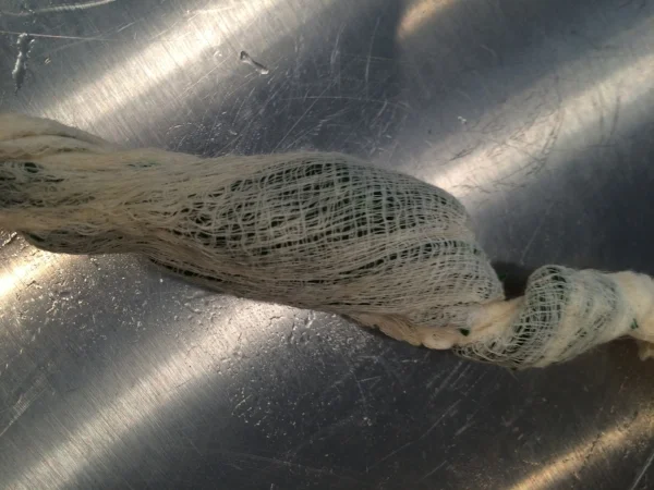 Then I plucked parsley leaves, washed them, blanched them for about 15 seconds, shocked them in ice water, and then wrung the daylights out of the parsley in a length of cheesecloth.