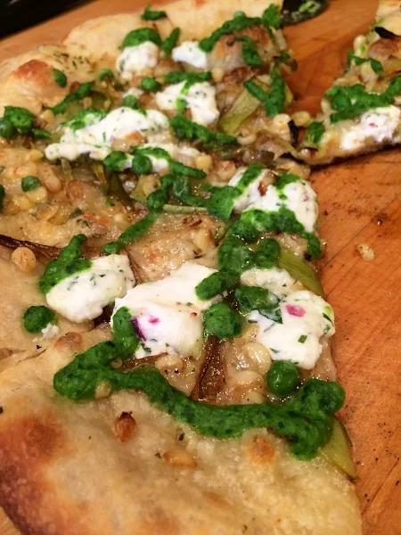 I topped the pie with the fried squash blossoms, supported by a small pile of dressed baby arugula, and drizzled the pea-parsley purée on top.