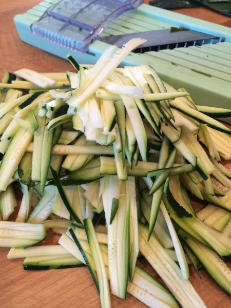 To prep the zucchini, I use my handy little Japanese mandoline to cut the zucchini into batons.