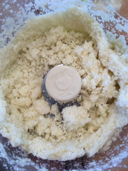 In the meantime, I prepped the cauliflower, I trimmed the head and then pulsed half of it in the food processor until super fine, slightly larger than grains of sand.
