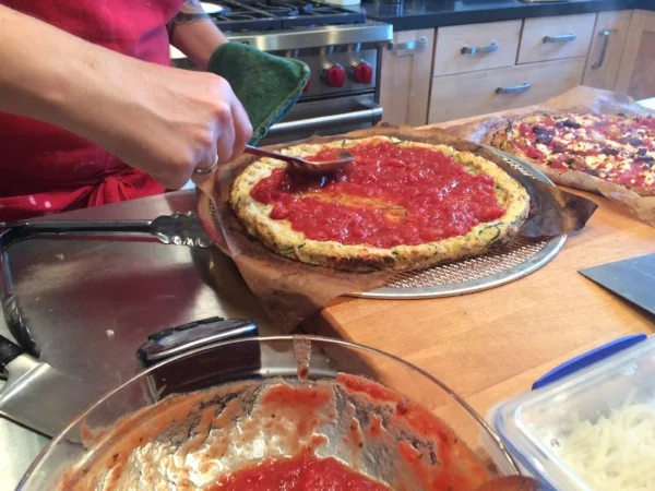 Going back to the zucchini, to combine both the zucchini and the uncooked cauliflower (in the work bowl of the food processor), I used my hand to incorporate the ingredients using almond and oat flour, one and a half egg, a half cup of cheddar cheese, some fresh herbs, and a little salt and pepper. I patted the dough with my hand onto a piece of parchment paper to a thickness ~1/4" and formed a lip around the edge to make a crust.
